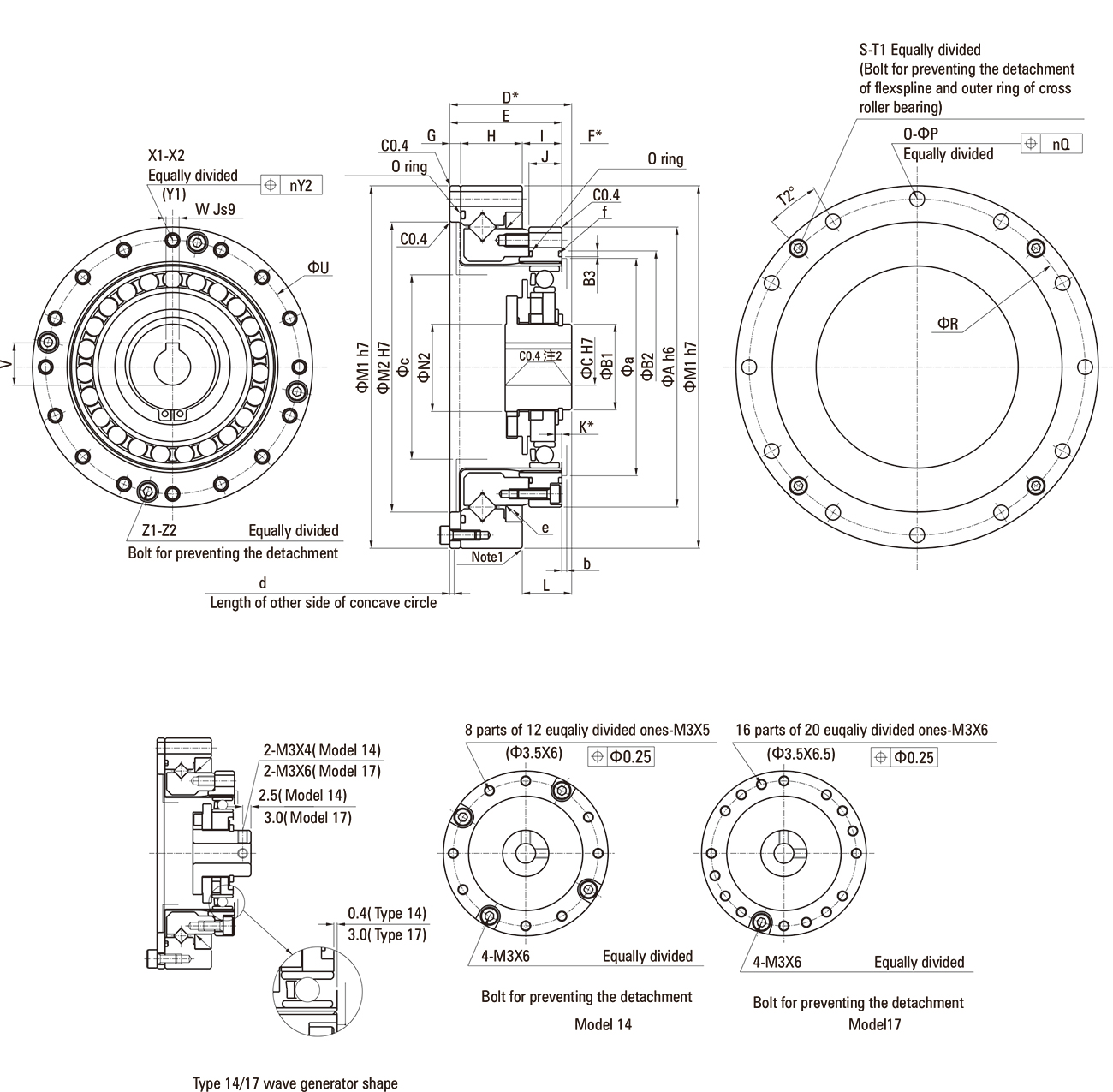 ·The following dimensions can be modified to accommodate customer-specific requirements. Wave Generator: C Flexspline: 0 and P Circular Spline: X, and X₂. |